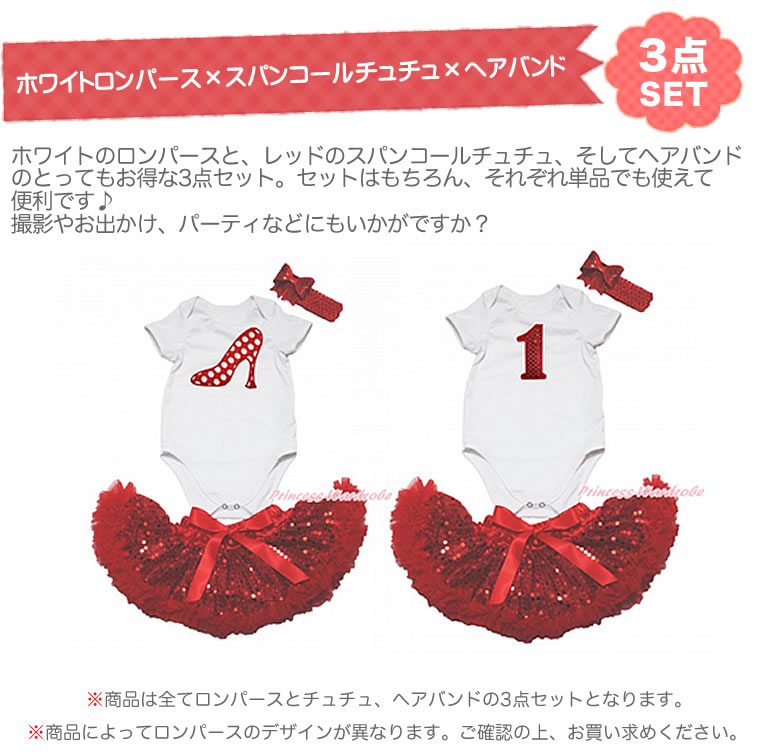 お得な3点セット! ホワイトロンパースとレッドスパンコールチュチュとヘアバンドのセット♪
