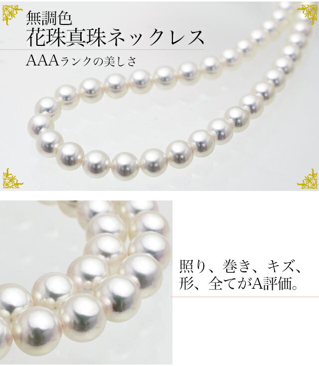 ≫真珠の評価(グレード)の見方は こちらのページでご説明しています 真珠の種類 あこや本真珠【花珠】 当店花珠ランク ハイクオリティ 真珠の色 ホワイト系 真珠のサイズ ネックレス 8.5mm-9.0mm ピアス/イヤリング 8.5mm-9.0mm 真珠の形 ラウンド 真珠のグレード 照りA:テリ最強 巻きA:厚い(0.4mm以上) キズA:ほぼ無し〜微キズ 長さ(クラスプ込み) 約42.5〜43cm クラスプ (留め金具) ビーンズクラスプ(silver) クラスプの変更をご希望の方は、こちらのページより別途ご購入下さい。