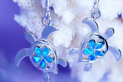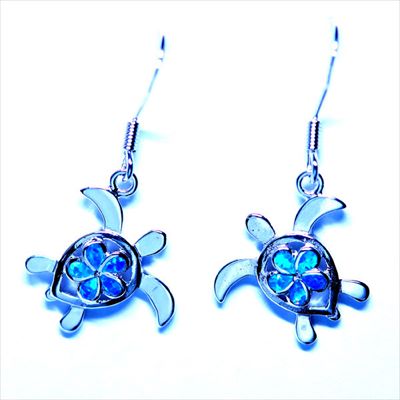 ホヌ(海がめ)&プルメリア透かしフレームデザイン 花びらブルーオパール装飾 レディース ハワイアンジュエリー シルバー925 アメリカンフック ピアス【カメ/縦16mm・花/7mm幅】