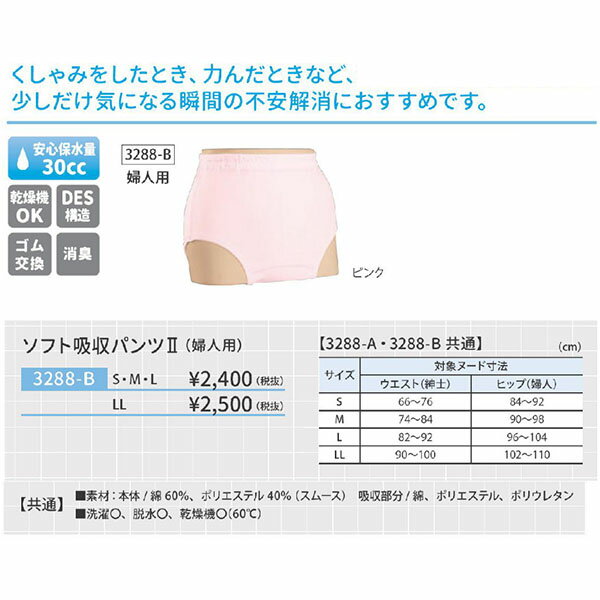 ●適応ヒップサイズ目安/S:84〜92cm、M:90〜98cm、L:96〜104cm ●素材/表:綿60%・ポリエステル40%(スムース)、吸収部分:綿・ポリエステル・ポリウレタン(四層構造) ●洗濯機可 ●脱水機可 ●乾燥機可(60℃) ●消臭加工 ●DES構造 ●ゴム交換 ・普通のパンツの形をそのままに、しっかり吸収して逆戻りを防止します。