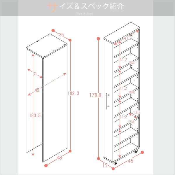 扉付隙間収納高さ211.1cm幅15〜24cm奥行46cm厚棚板(棚板厚み2.5cm)上下片開き 扉高さ142.2cm 扉付居間シェルフ 隙間収納